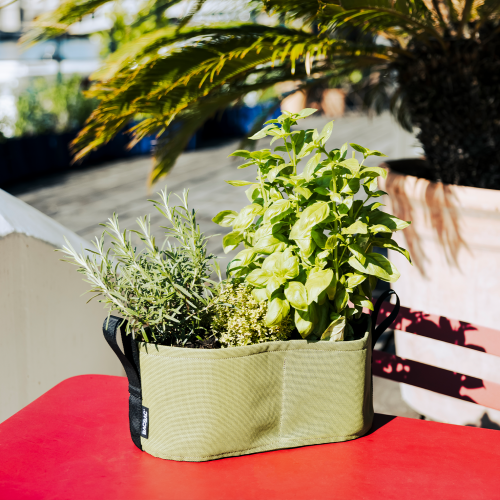 Fill directly with soil paying attention to stretch the fabric and then plant. This small window box is permeable to let the soil breathe and the excess of water flow out. If you wish to use your BACSAC® inside, protect the floor of humidity with a dish. 100% recyclable, BACSAC® suits all environments. Its technical multi-layered fabric maintains the necessary balance between air, soil and water. Tear strength, abrasion and UV-resistant, the outside fabric can withstand extreme temperatures. Inside, the geotextile felt layer protects and contains the roots, limits evaporation and distributes water. Registered design
