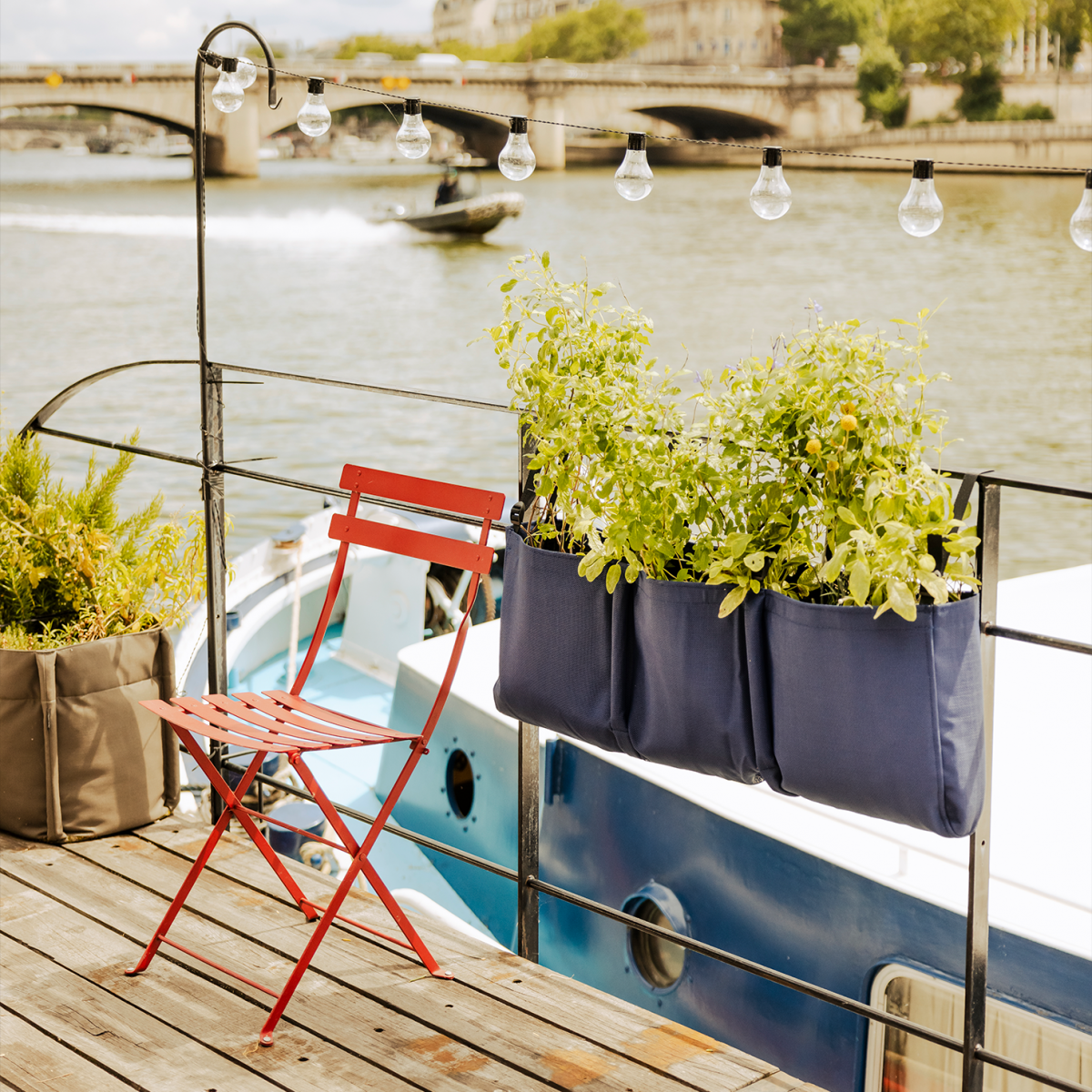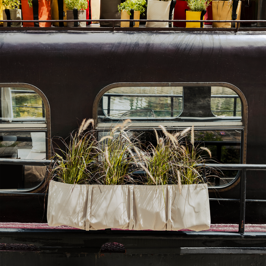 Its technical multi-layered fabric maintains the necessary balance between air, soil and water. Tear strength, abrasion and UV-resistant, the outside fabric can withstand extreme temperatures. Inside, the geotextile felt layer protects and contains the roots, limits evaporation and distributes water. This hanging window box is permeable to let the soil breathe and the excess of water flow out.