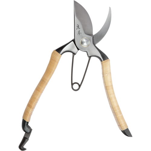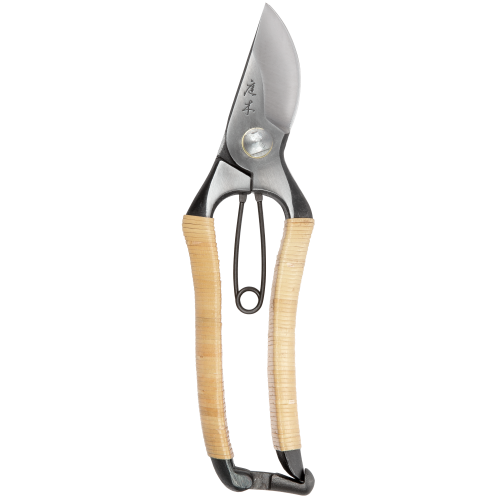 Limited edition Japanese secateurs hand-forged in S58C carbon steel, featuring rattan-wrapped handles for a natural and elegant grip.